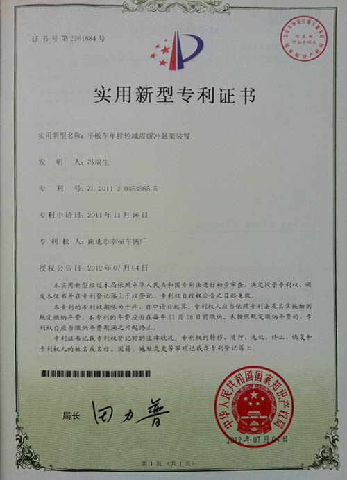平板車(chē)單排輪減震緩沖懸架裝置專(zhuān)利證書(shū)